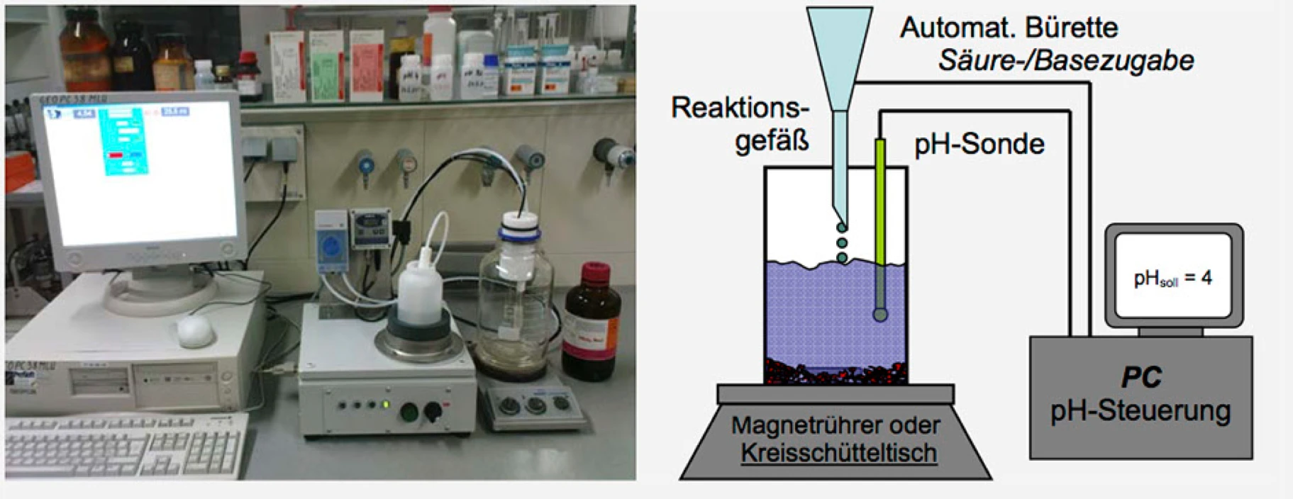 The pH-stat method is used to assess the mobilisability of mainly (heavy) metals and metal ions by elution in an aqueous medium at a constant pH value of 4 or 11. The simulated "worst case" conditions of the leaching of soils, waste materials or landfill material provide a long-term risk prognosis for the discharge of pollutants from solids and the pH value development of a leachate in a short time. Elution at pH 4 simulates the natural weather influence of "acid rain". In contrast, pH 11 comes close to mobilisation conditions such as those caused by alkaline leachates (e.g. in rust ash landfills) or humic substances (e.g. in eutrophic waters).
