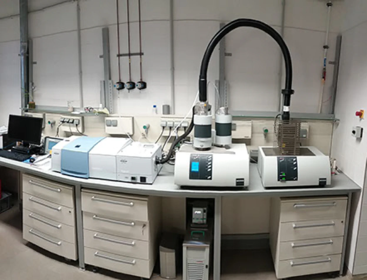 ‍The ‍Thermobalance ‍STA ‍449 ‍F3 ‍Jupiter® ‍der ‍Company ‍Netzsch ‍is ‍with ‍zwei ‍Öfen ‍auf ‍der ‍Doppelhubvorrichtung ‍ausgestattet. ‍Thermal ‍analyses ‍can be carried out ‍from ‍room temperature ‍to ‍1500 ‍°C ‍. ‍The ‍connection ‍of ‍protective ‍and ‍purge gases ‍can ‍be used ‍at ‍Ofenraum ‍definierte ‍Atmosphären ‍realisieren ‍(shielding gas, ‍synthetische ‍Luft). ‍According to ‍questions ‍samples ‍can be ‍analysed under ‍oxidising ‍and ‍reducing ‍ ‍werden. ‍The ‍direct ‍couplings ‍der ‍thermobalance ‍with ‍a ‍FT-IR unit ‍der ‍company ‍Bruker ‍Optics ‍und ‍einem ‍Massenspektrometer ‍(also ‍Netzsch) ‍erlaubt ‍zudem ‍Aussagen ‍über ‍die ‍freigesetzten ‍Gase ‍sowie ‍die ‍gasförmigen ‍Zersetzungsprodukte. ‍With ‍the ‍FT ‍- ‍IR ‍- ‍Analysis Unit ‍let ‍you ‍in ‍Standalone ‍- ‍operation ‍ergänzend ‍kondensierte ‍Substanzen ‍schwingungsspektroskopisch ‍charakterisieren. ‍According to ‍operating mode ‍the following ‍spectral ranges ‍can ‍be measured:‍